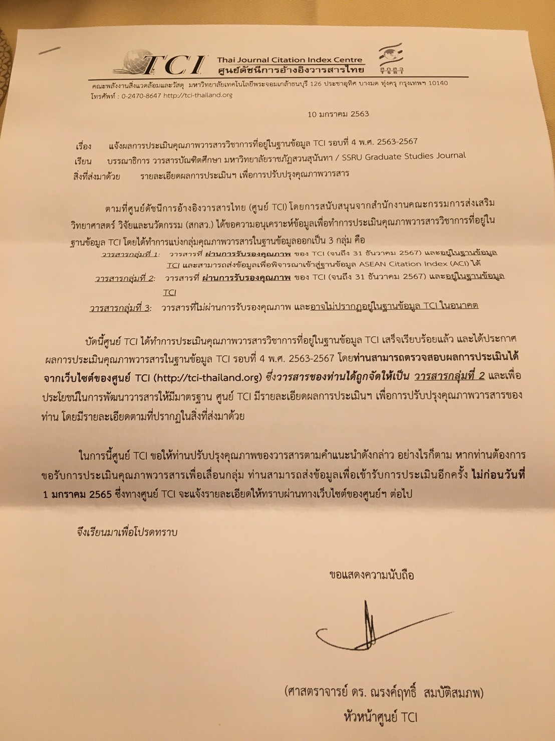 Asst. Prof. Dr. Duangsamorn Rungsawanpho and research personnel to participate in "The 13th Thai Journal of Academic Network Development Conference" organized by the TCI Thai Journal Citation Index Centre. Suan Sunandha Rajabhat University is ranked in the TCI Group 2 from the 4th assessment results (2020-2024) on January 10, 2020.