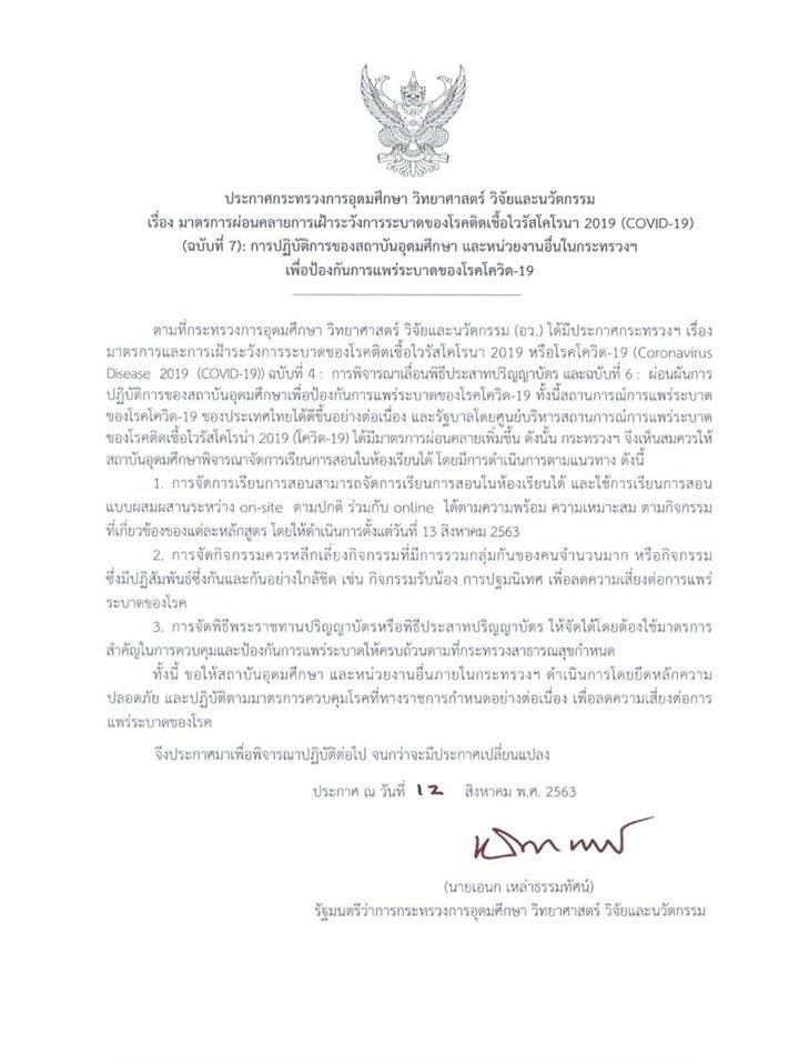 > ประกาศกระทรวงการอุดมศึกษา วิทยาศาสตร์ วิจัย และนวัตกรรม เรื่อง มาตรการผ่อนคลายการเฝ้าระวัง การระบาดของโรคติดเชื้อไวรัสโคโรนา 2019 (COVID-19) ฉบับที่ 7