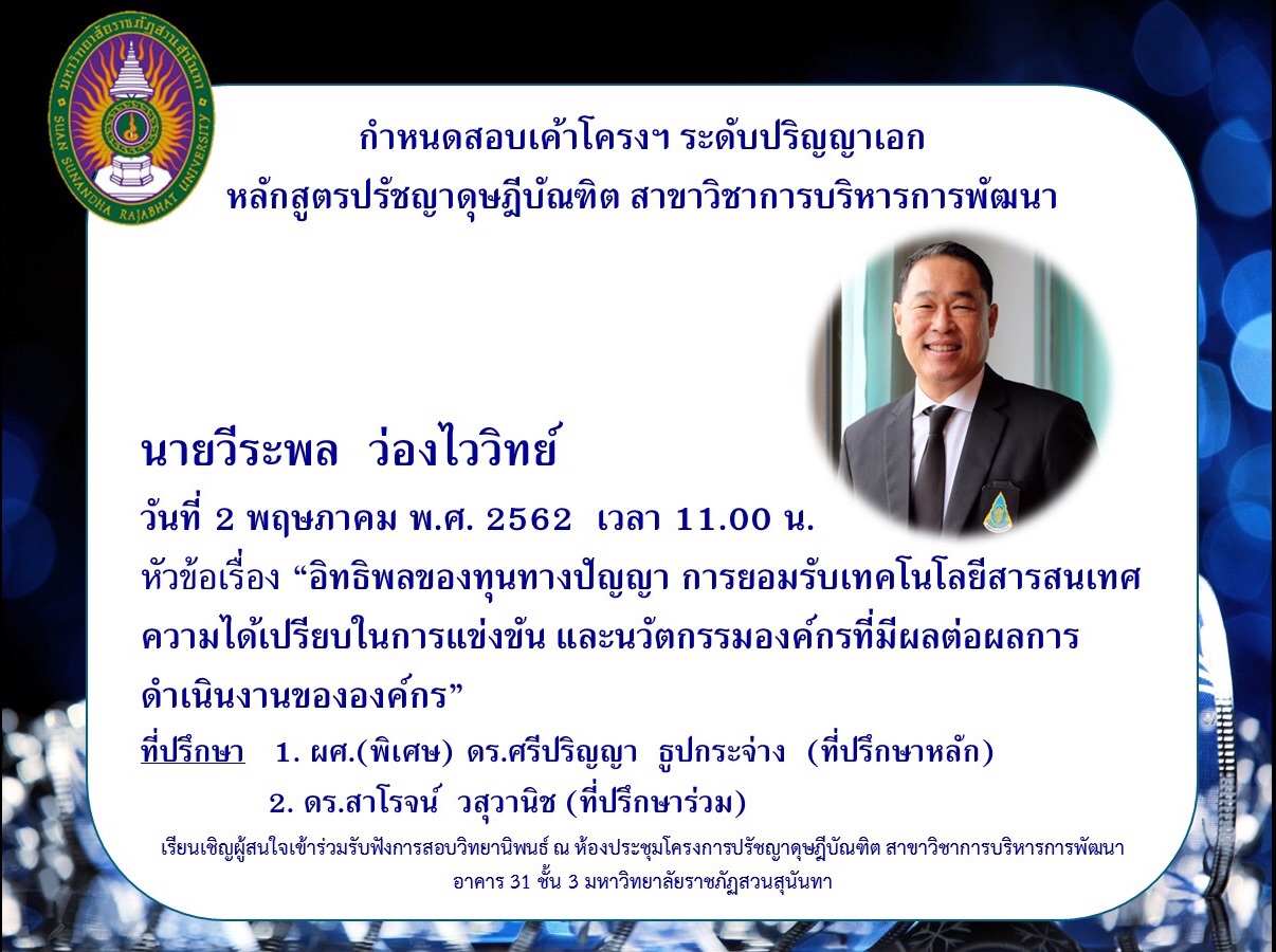 > ขอเชิญเข้าร่วมรับฟังการสอบเค้าโครง/ป้องกันวิทยานิพนธ์ สาขาวิชาการบริหารการพัฒนา ประจำเดือนพฤษภาคม 2562