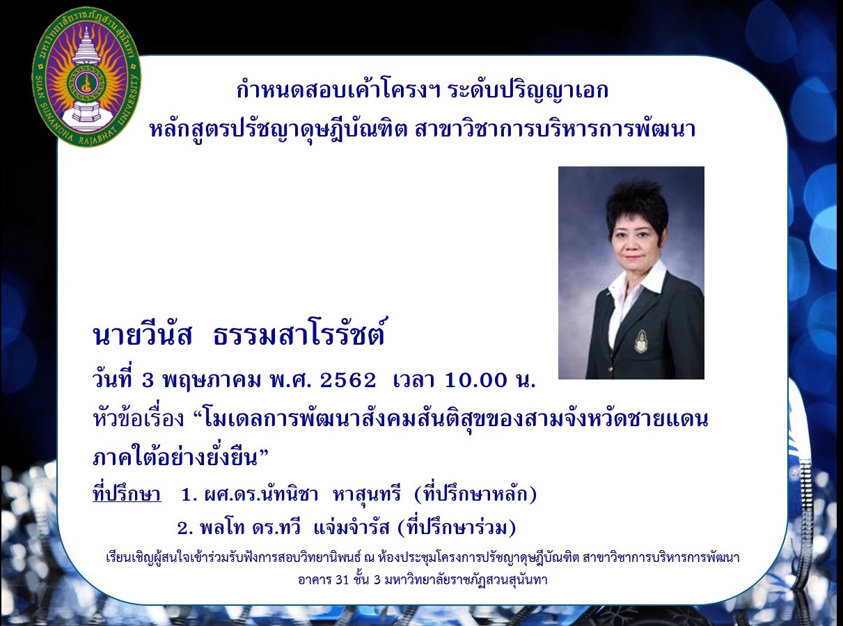 ขอเชิญเข้าร่วมรับฟังการสอบเค้าโครง/ป้องกันวิทยานิพนธ์ สาขาวิชาการบริหารการพัฒนา ประจำเดือนพฤษภาคม 2562