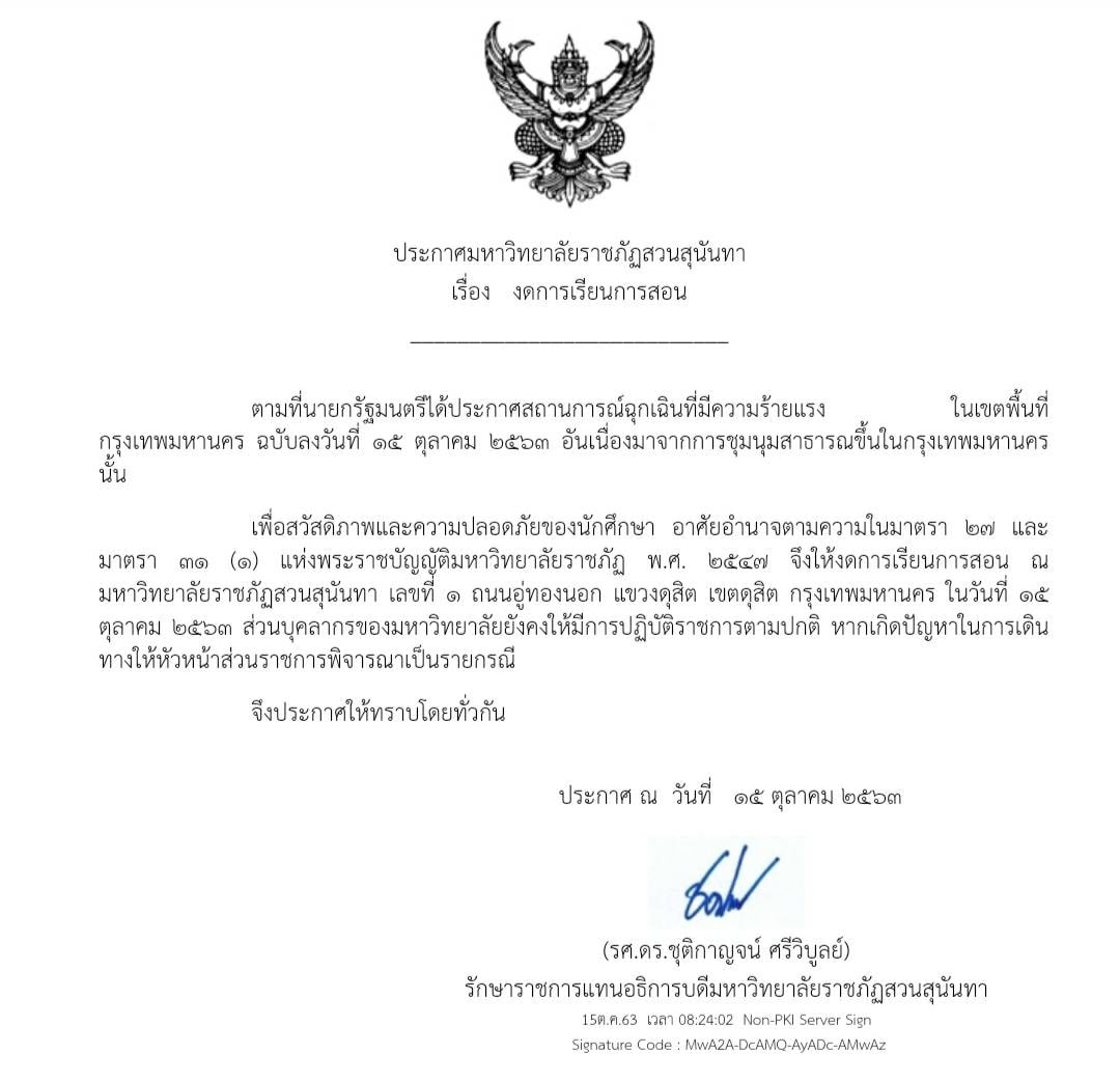 ประกาศมหาวิทยาลัยราชภัฏสวนสุนันทา เรื่อง งดการเรียนการสอน