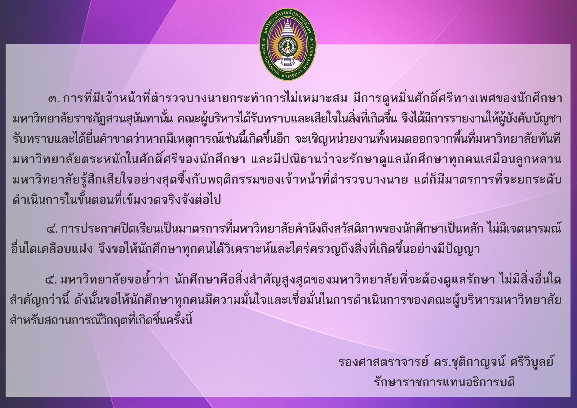 แถลงการณ์อธิการบดีในสถานการณ์การชุมนุม